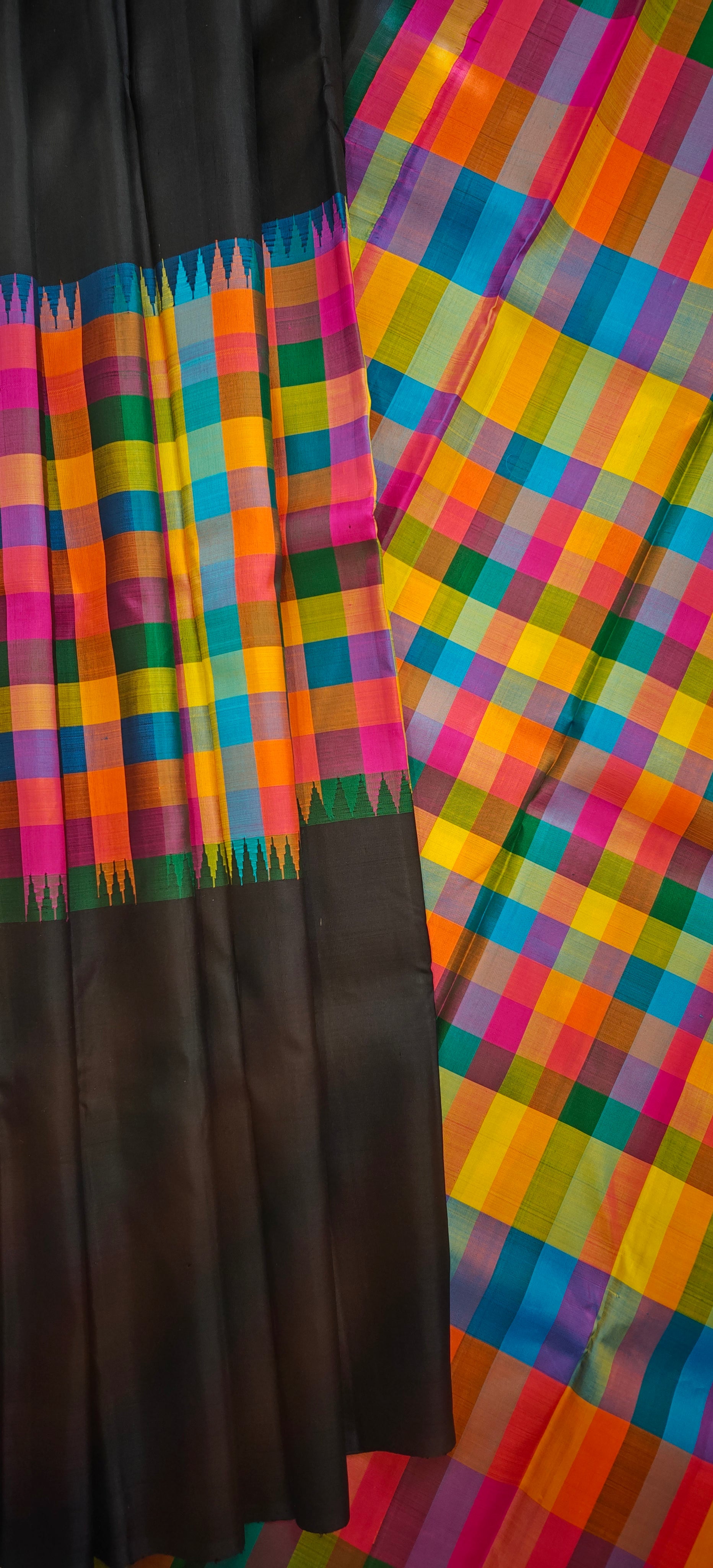 Black and multi colour checks kanjivaram silk saree