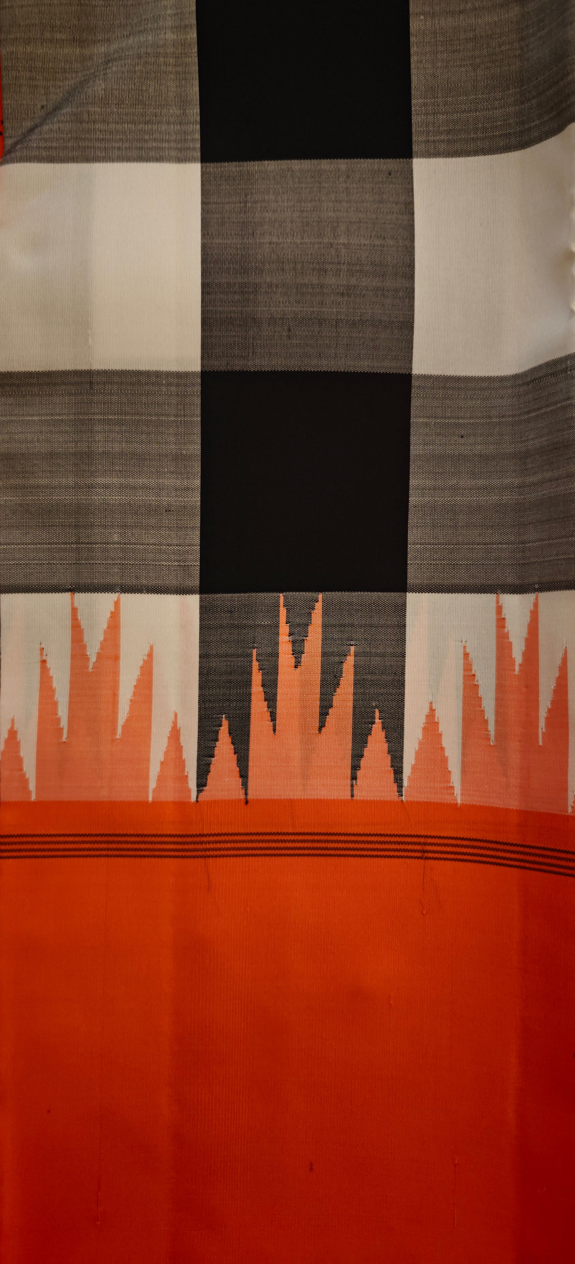A classic must-have design is the kanjivaram checks (multi coloured checks) sari with an orange border and pallu.
