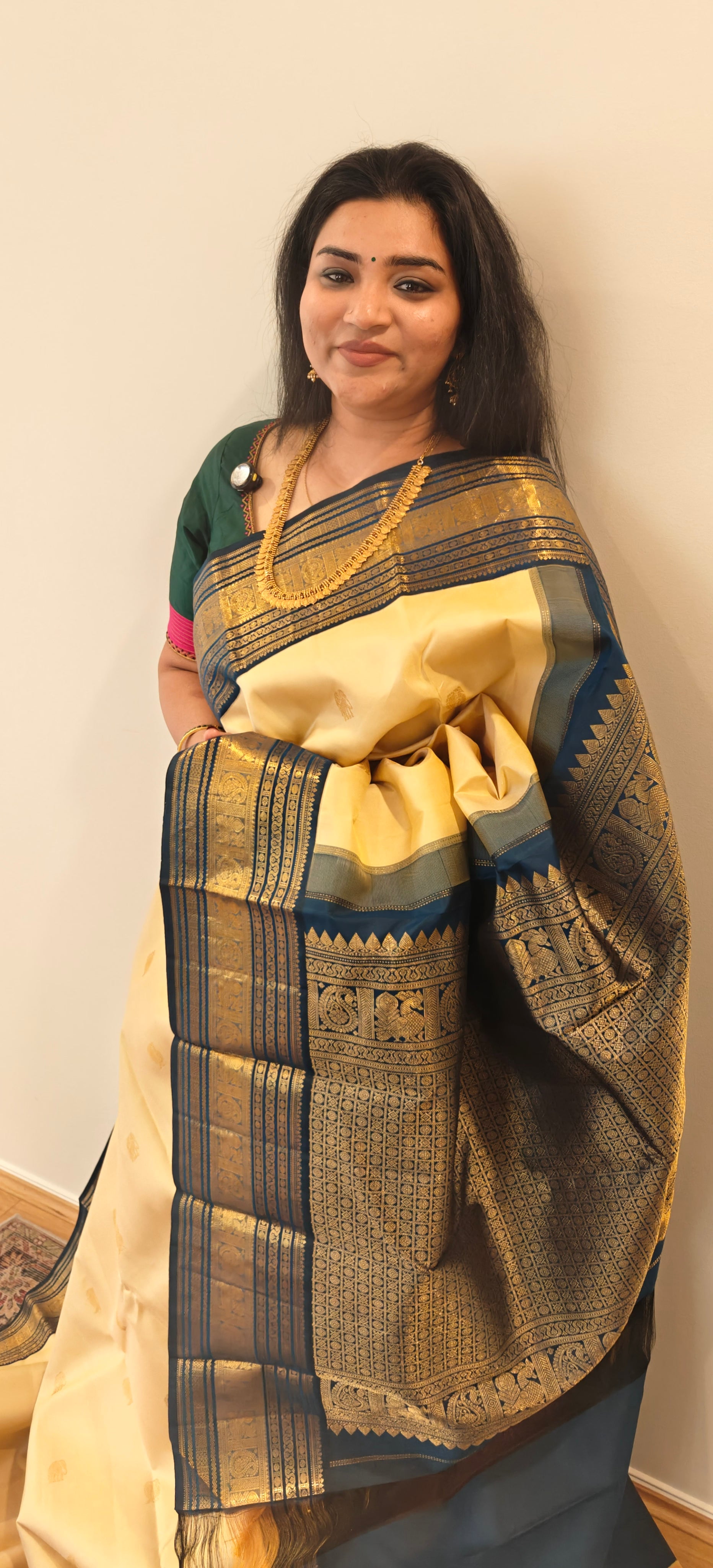 A golden beige body Color with elephant motifs throughout with a gorgeous sapphire blue border- the beautiful pallu is super intricate with buttas within a checks designs