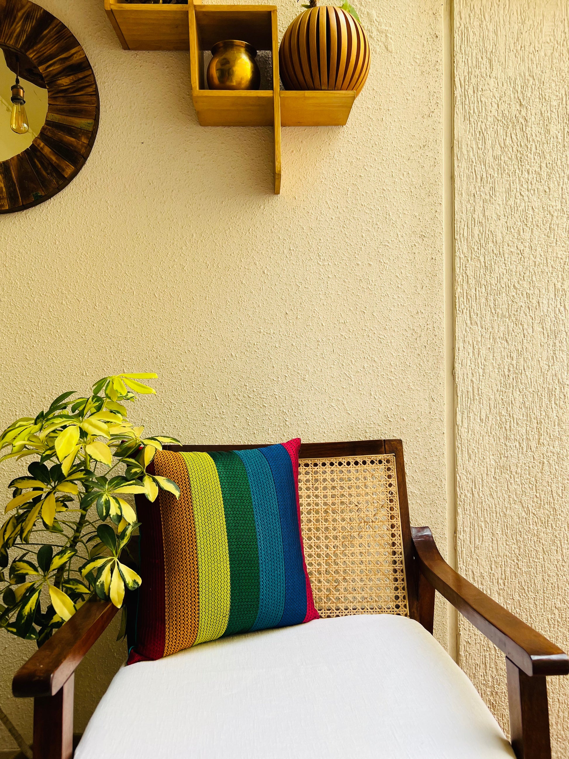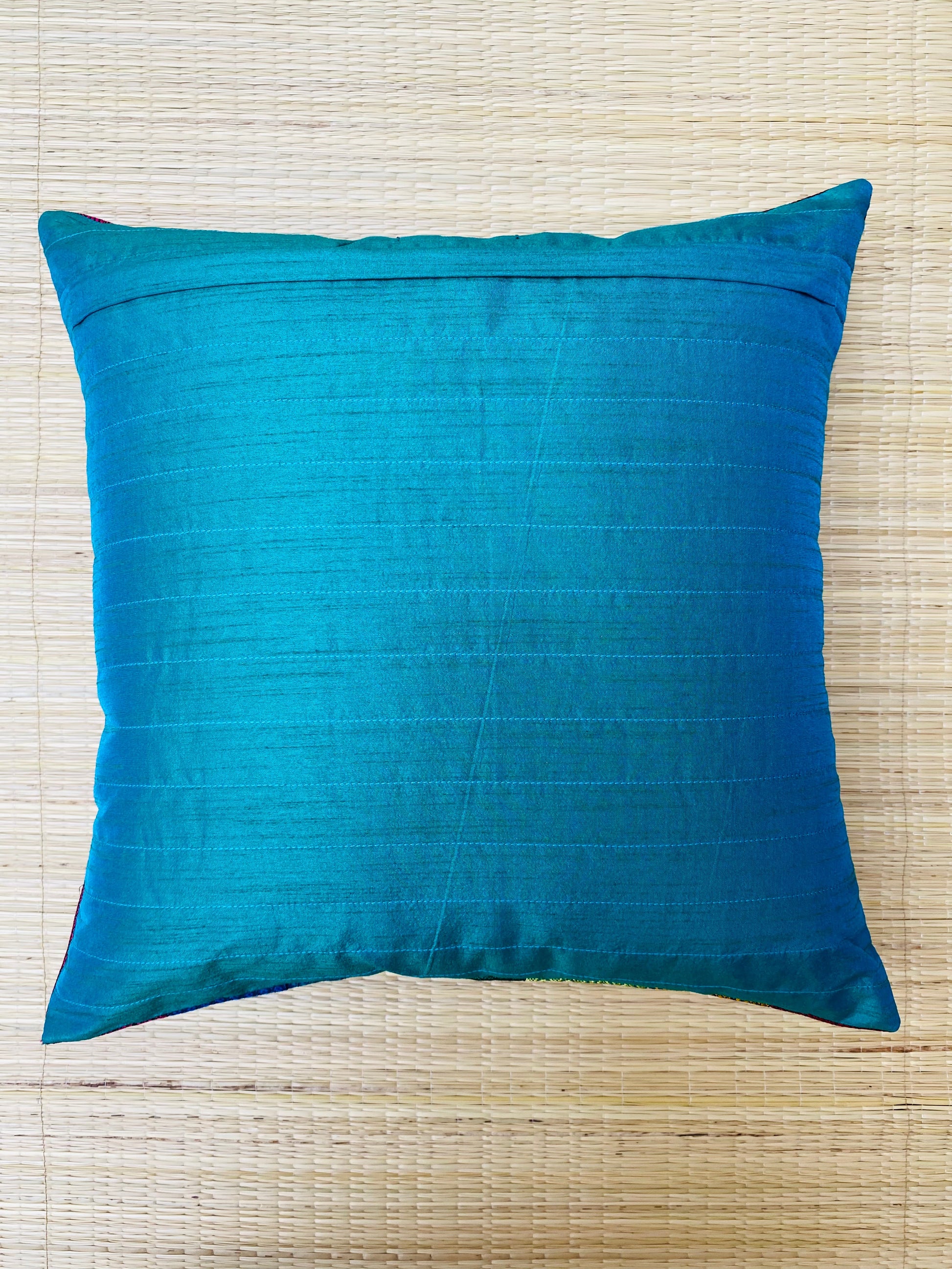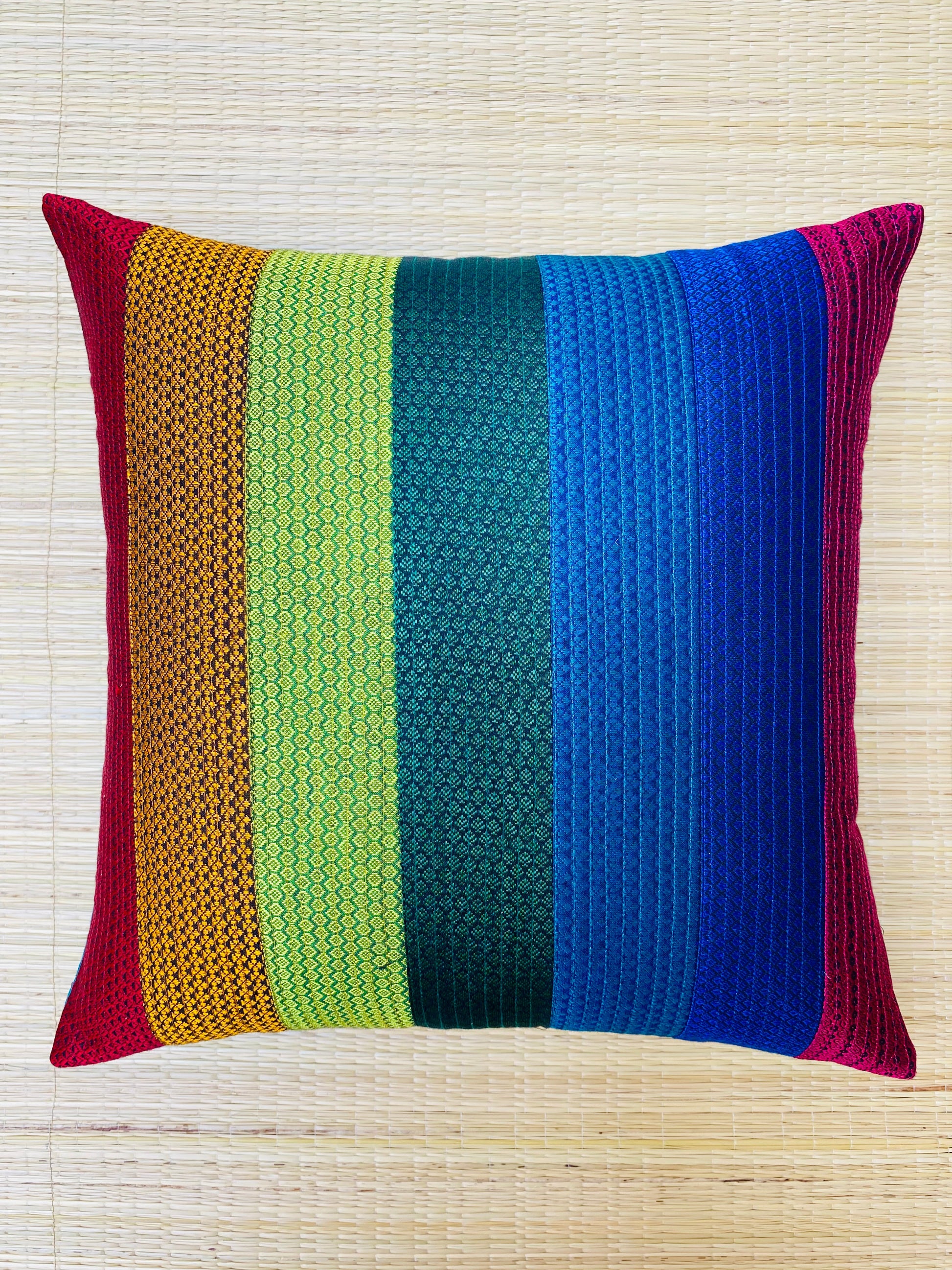 Indhradhanush (Rainbow) Colors -Silk Cushion Cover-16*16 (Set of 2) (Copy) is an opulent set of two cushion covers made with vibrant Khunn fabric in a variety of weaves to create a stunning rainbow design. Each panel is carefully crafted with top stitching and lined for a flawless finish. The coordinated plain back adds a touch of sophistication, with a zipper fastener for easy use.