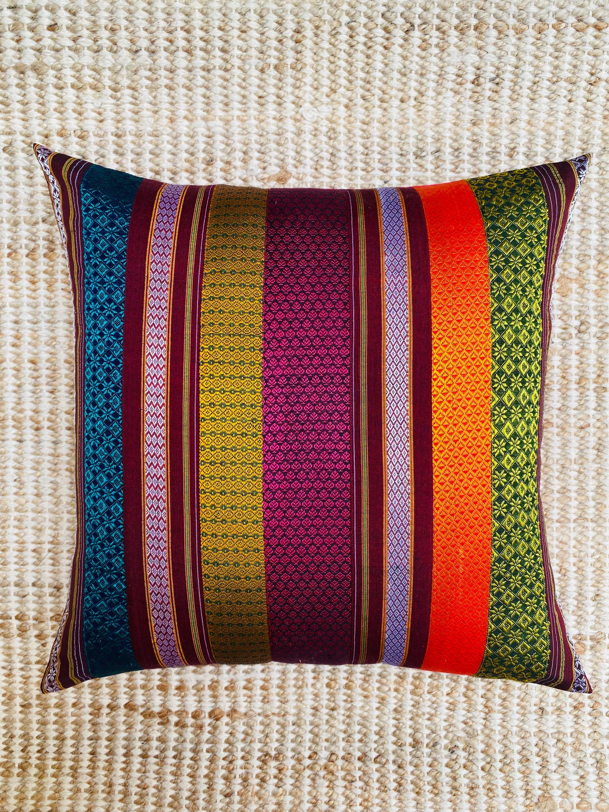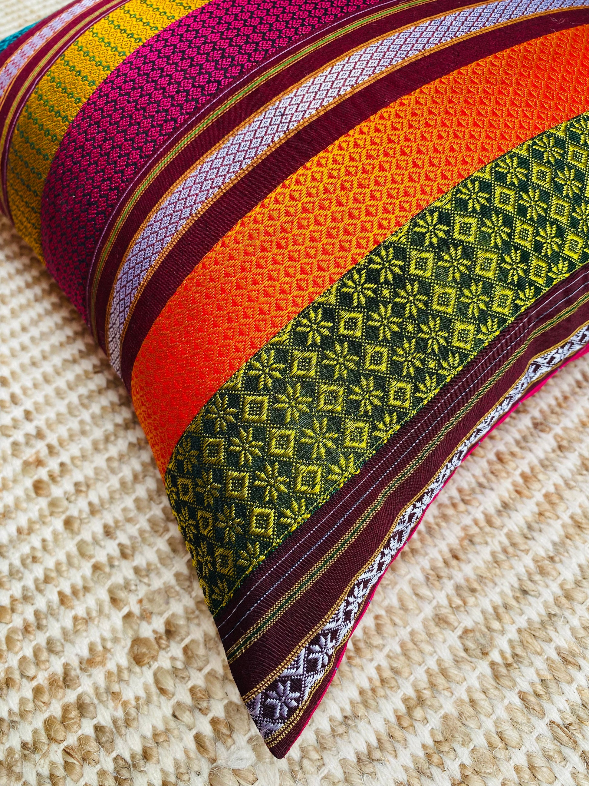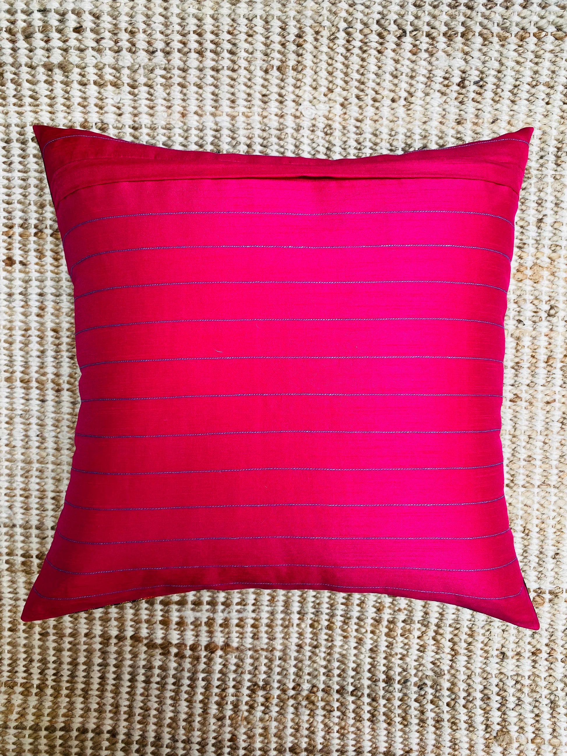 Introducing our set of 2 Multicolor Silk Cushion Cover. Made from luxurious silk fabric, this exclusive piece features a unique blend of weaves and border patterns in sophisticated tones. Meticulously crafted with precision and lined with a zipper fastener for a ethnic touch. Elevate your home décor with this elegant cushion covers.