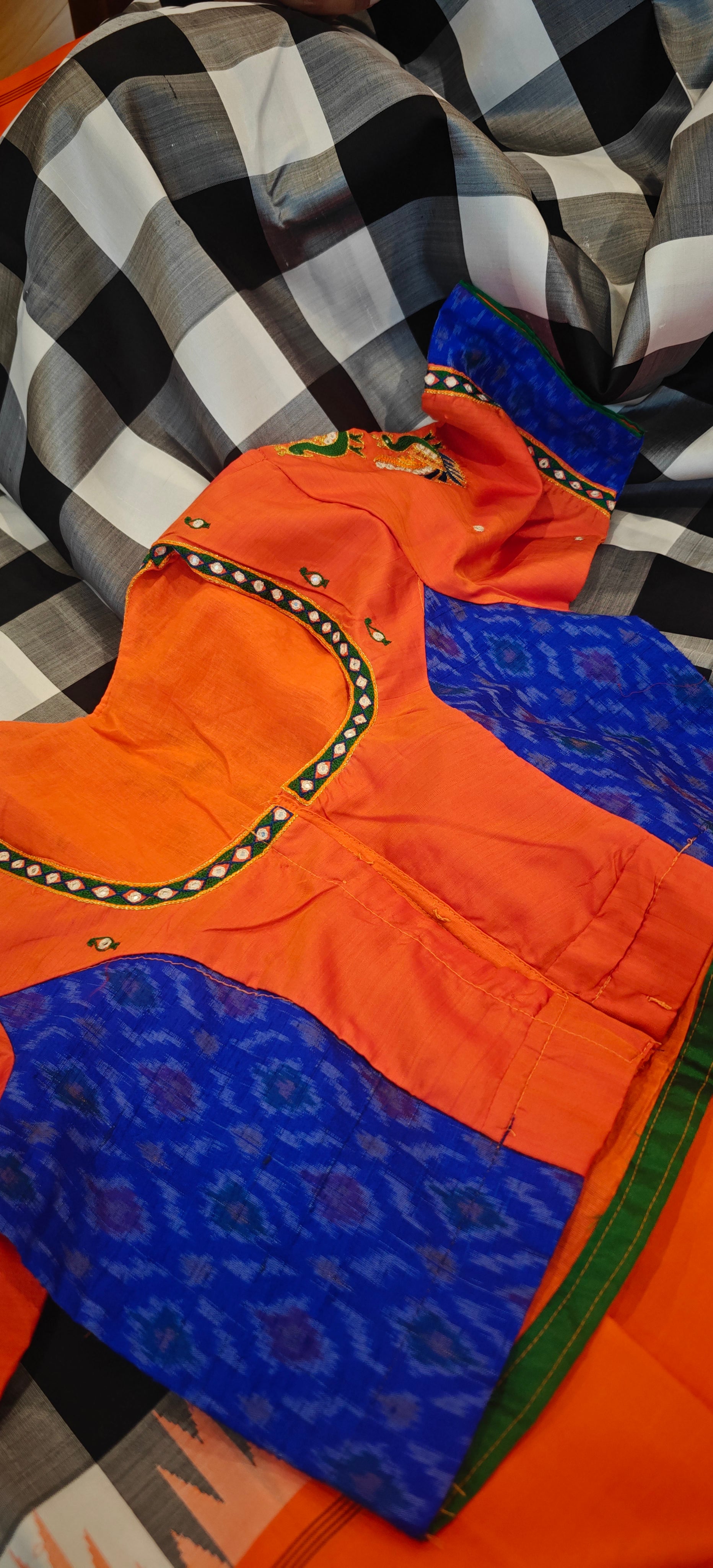 The Orange and Blue Ikkat Patchwork Handcrafted Blouse features a unique design created with blue Ikkat silk and intricate peacock motifs. This blouse exemplifies traditional craftsmanship, ensuring durability and comfort. The vibrant colors and detailed patchwork enhance aesthetic appeal, making it suitable for both casual and formal occasions.
