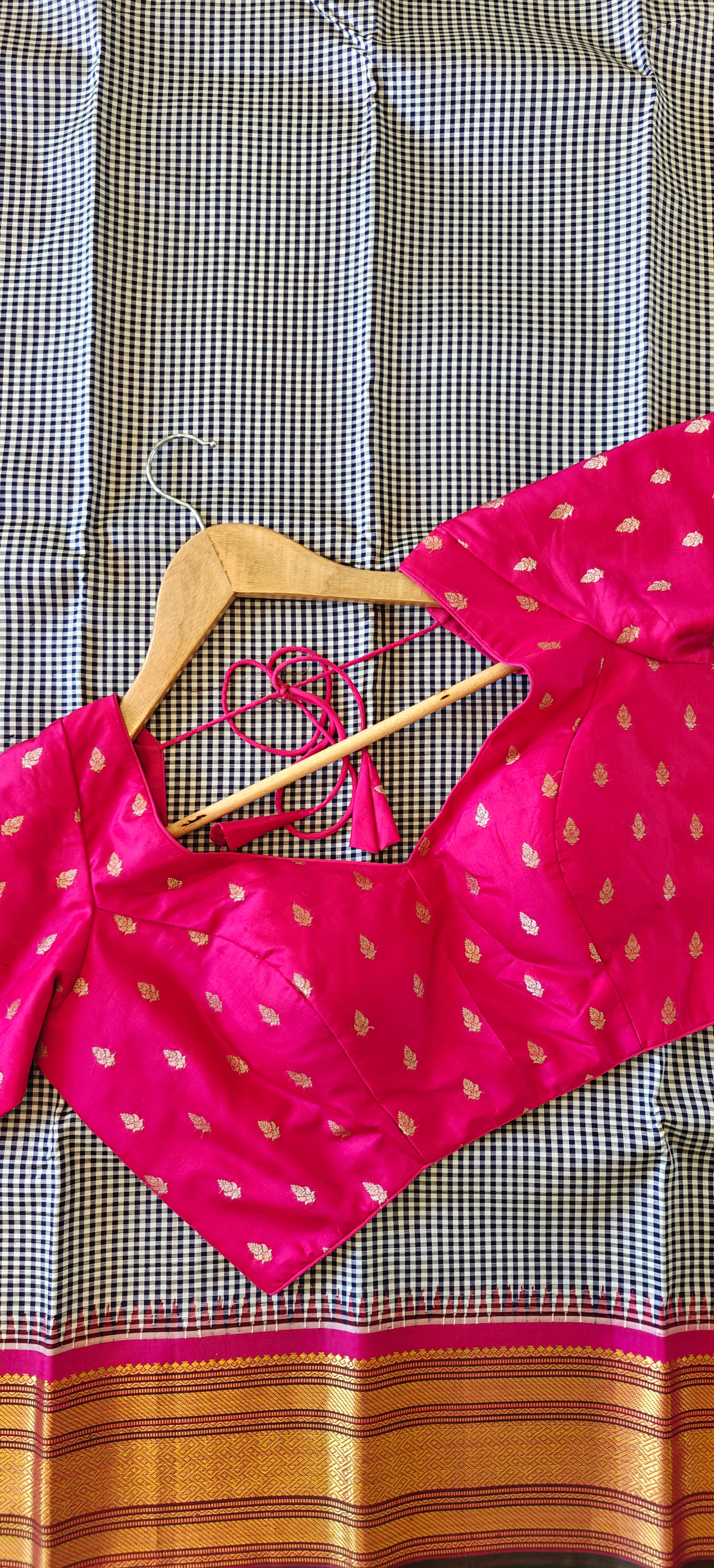 Add some unique flair to your wardrobe with our Pink Silk Benarasi and Kanjivaram Blouse! Made from luxurious silk, this blouse features intricate gold work detailing for a touch of traditional charm. Pair it with your favorite saree or lehenga for a stylish and elegant look.