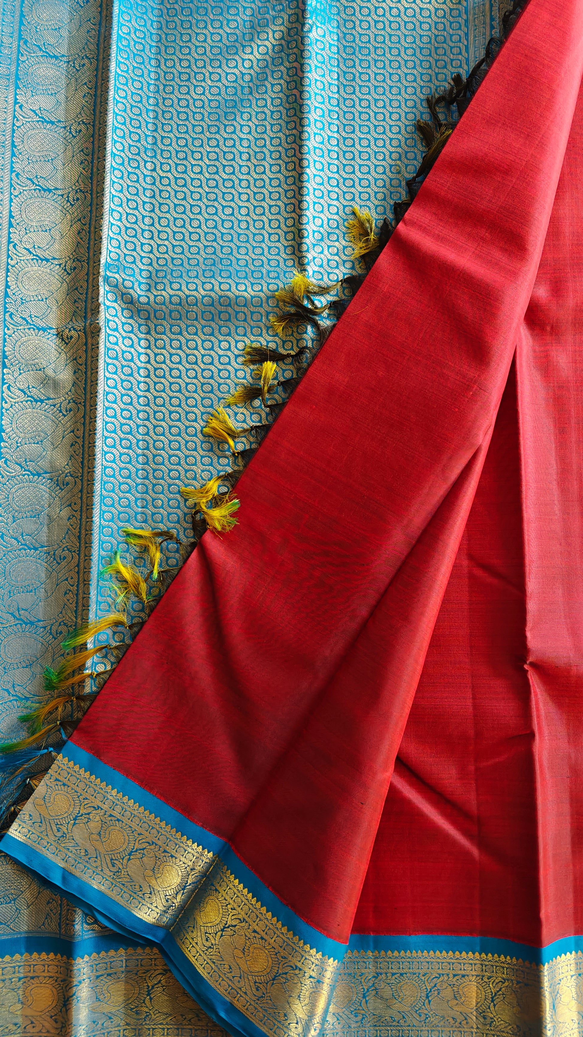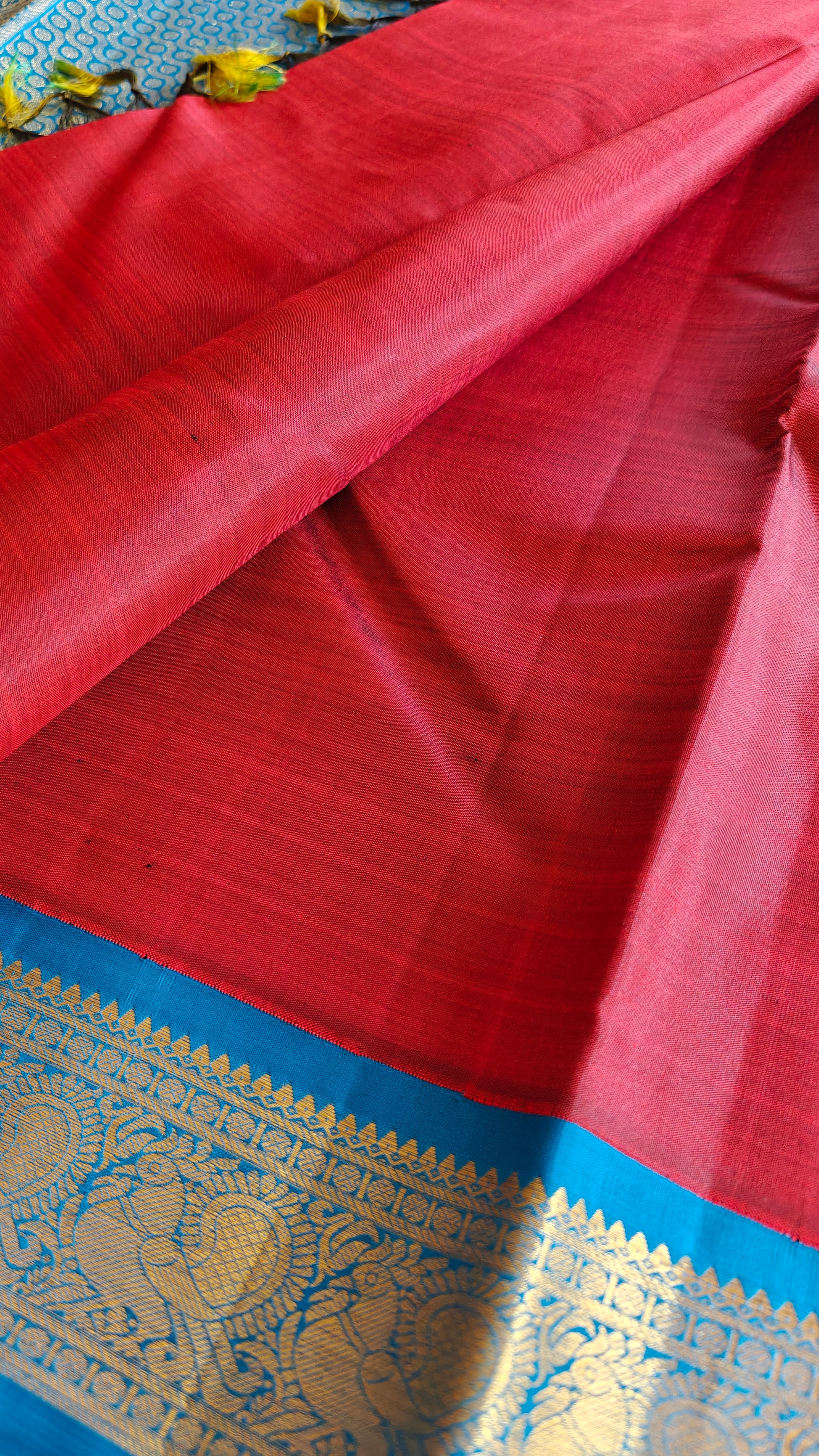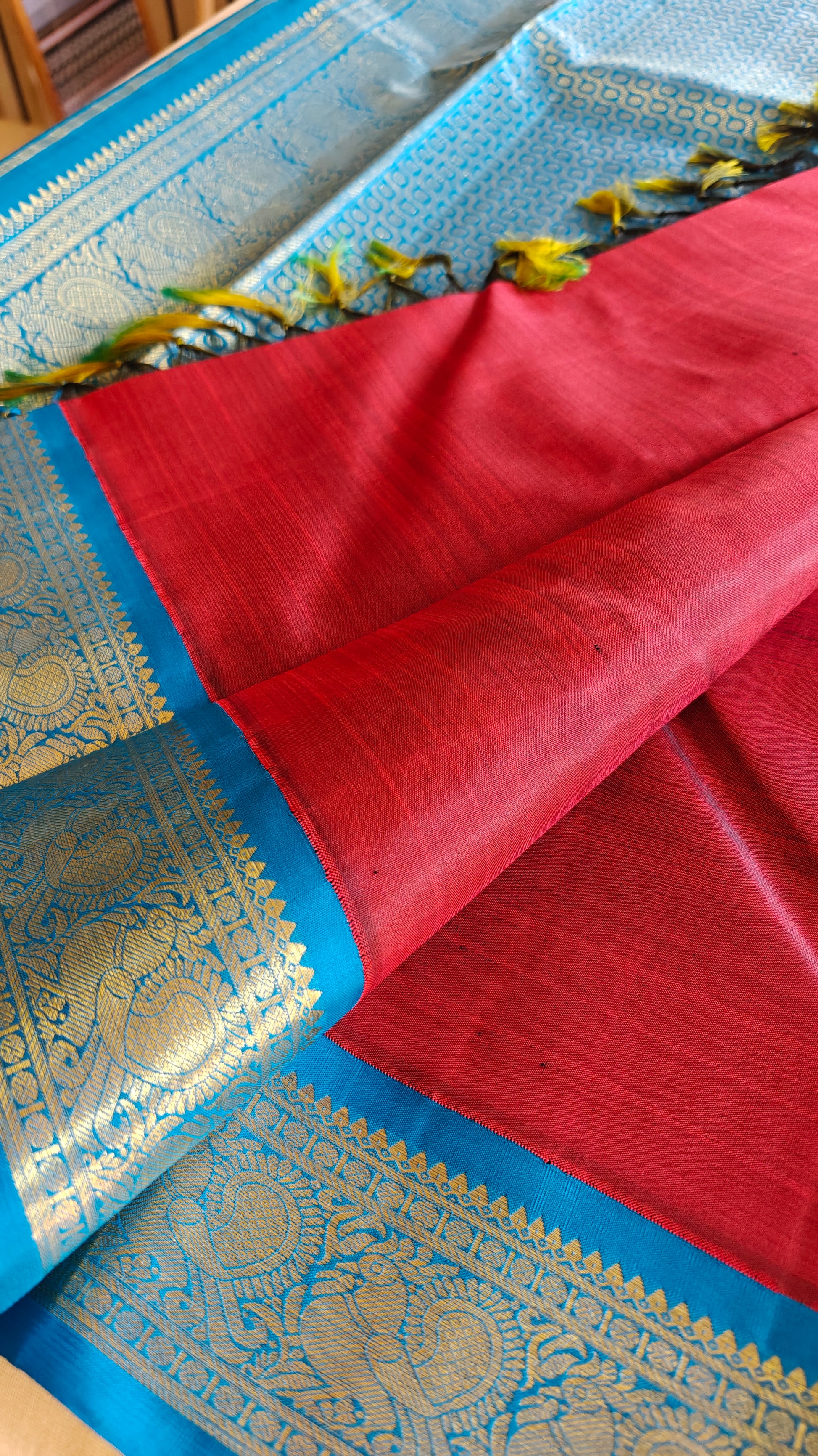 Experience the elegant beauty of our Wine Red and Blue korvai -Kanjivaram Silk Saree. Adorned with exquisite peacock designs and a striking colour combination, this saree effortlessly blends tradition with modernity. Made with the finest silk, this saree is perfect for any occasion.