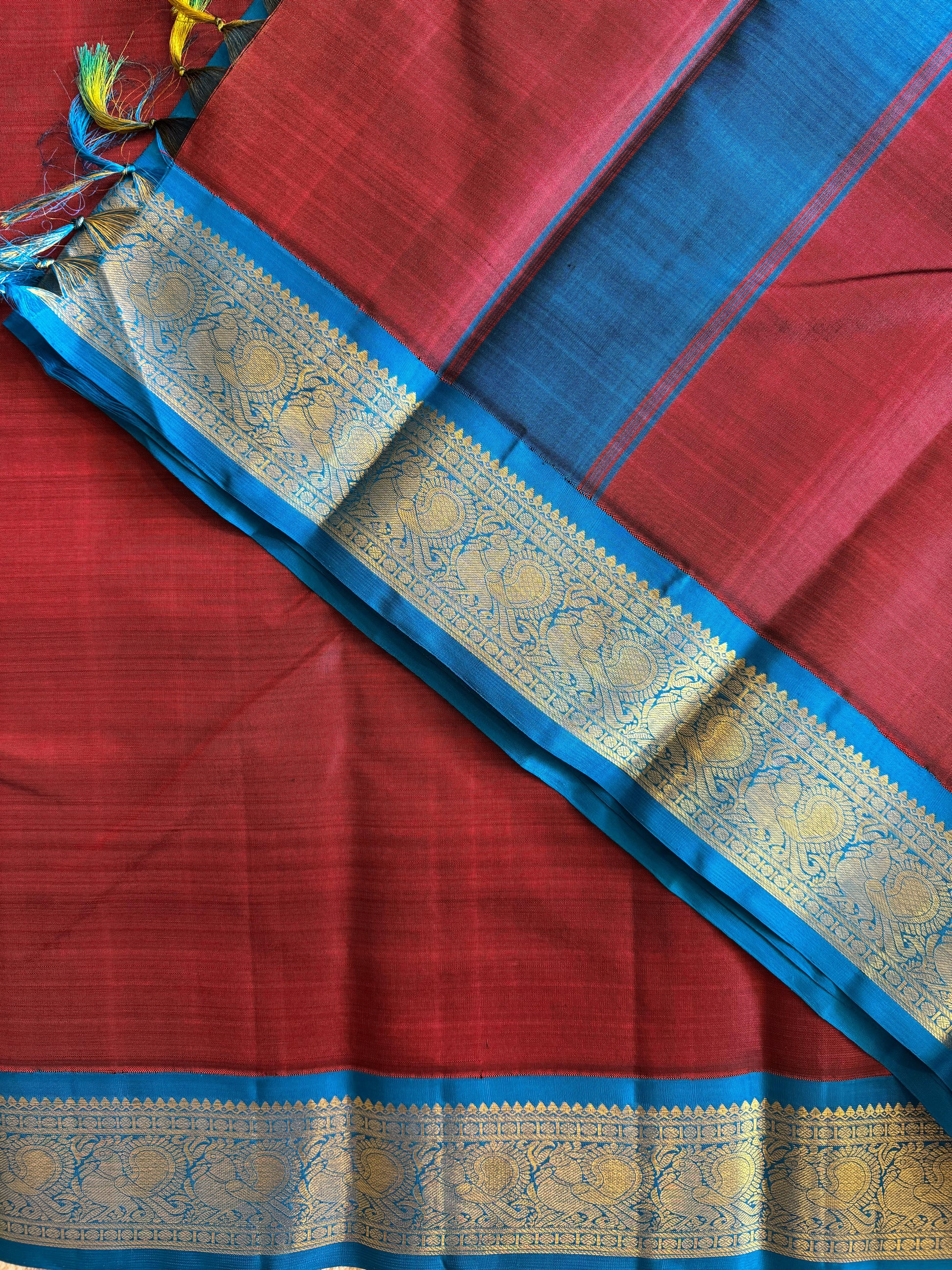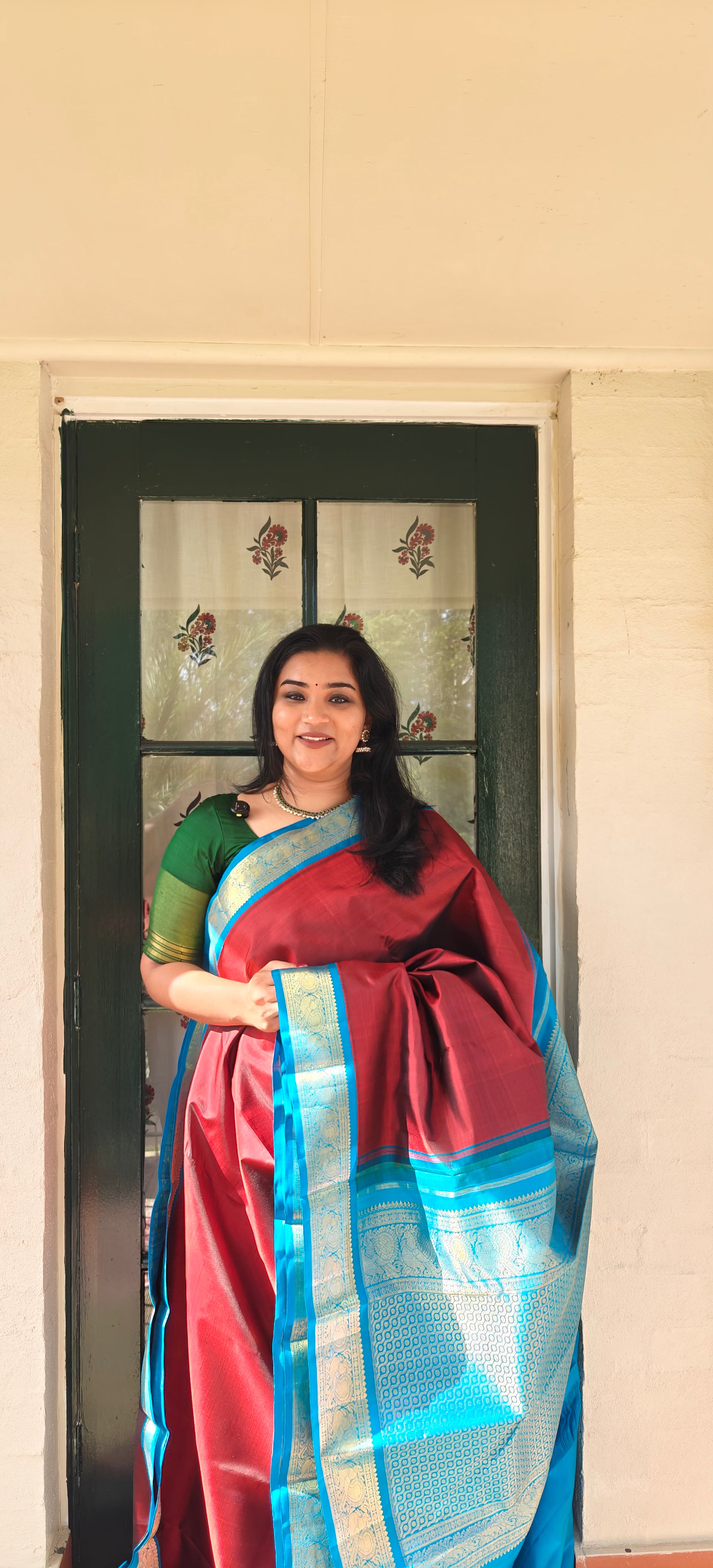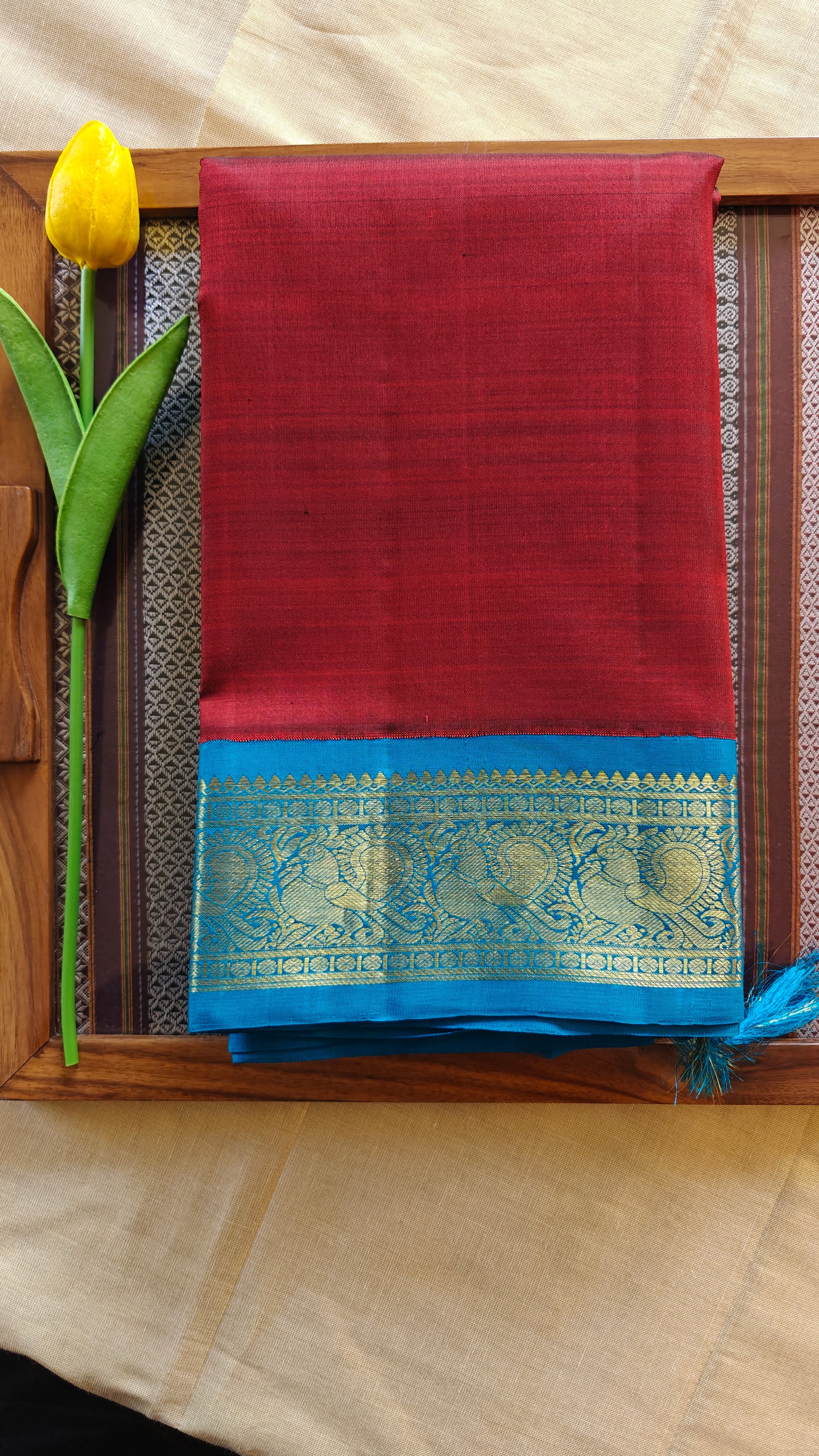 Wine Red and Blue korvai -Kanjivaram Silk Saree