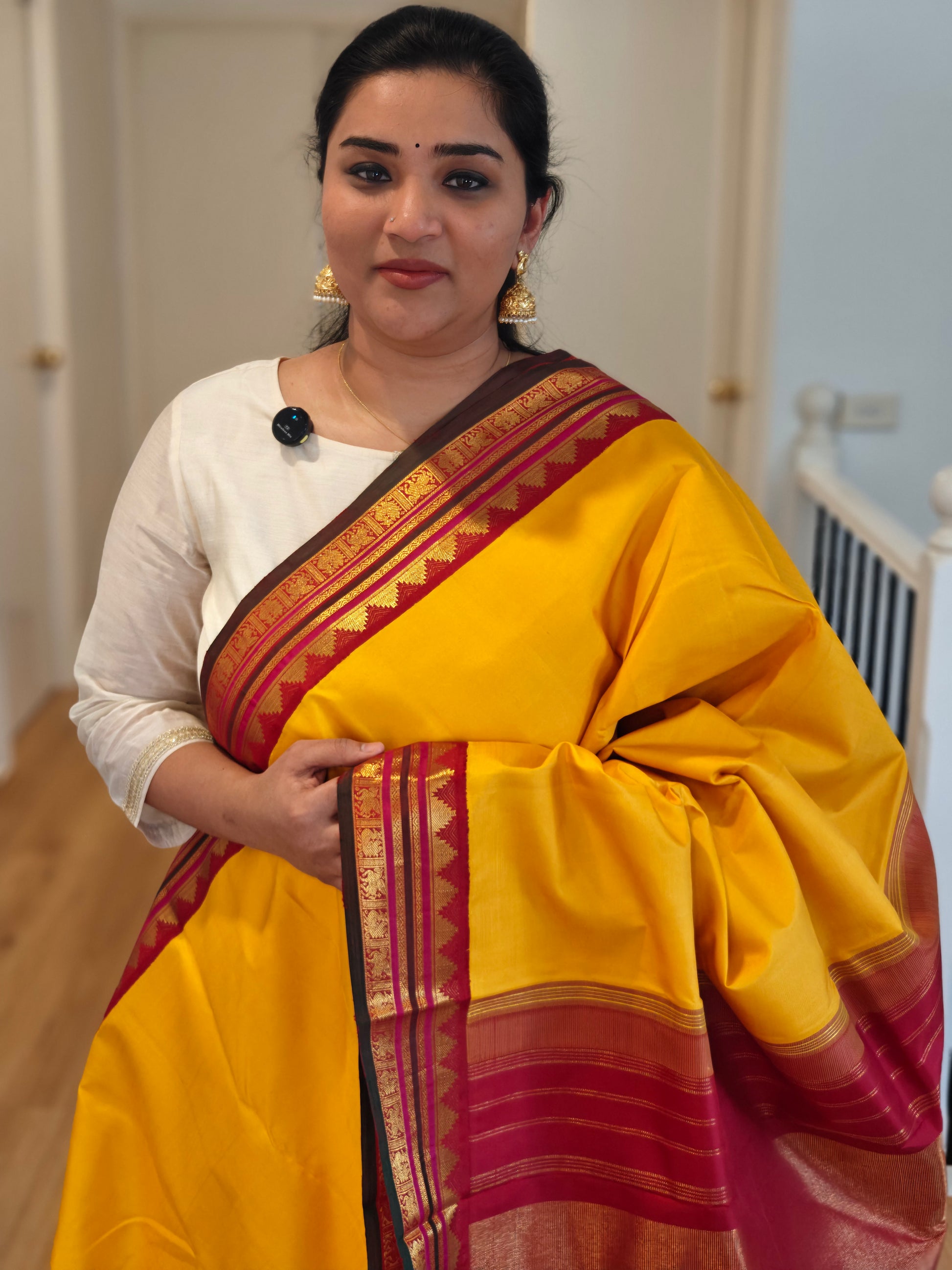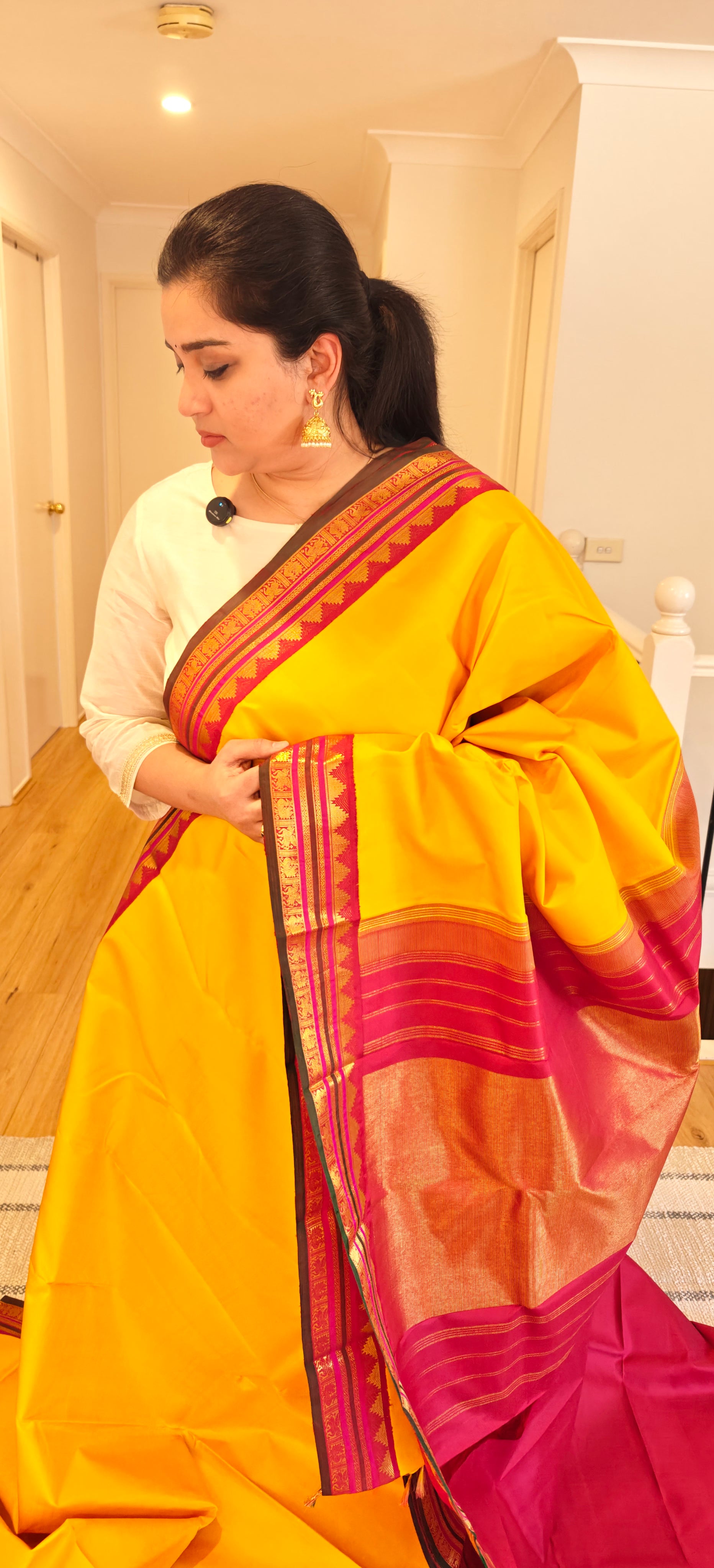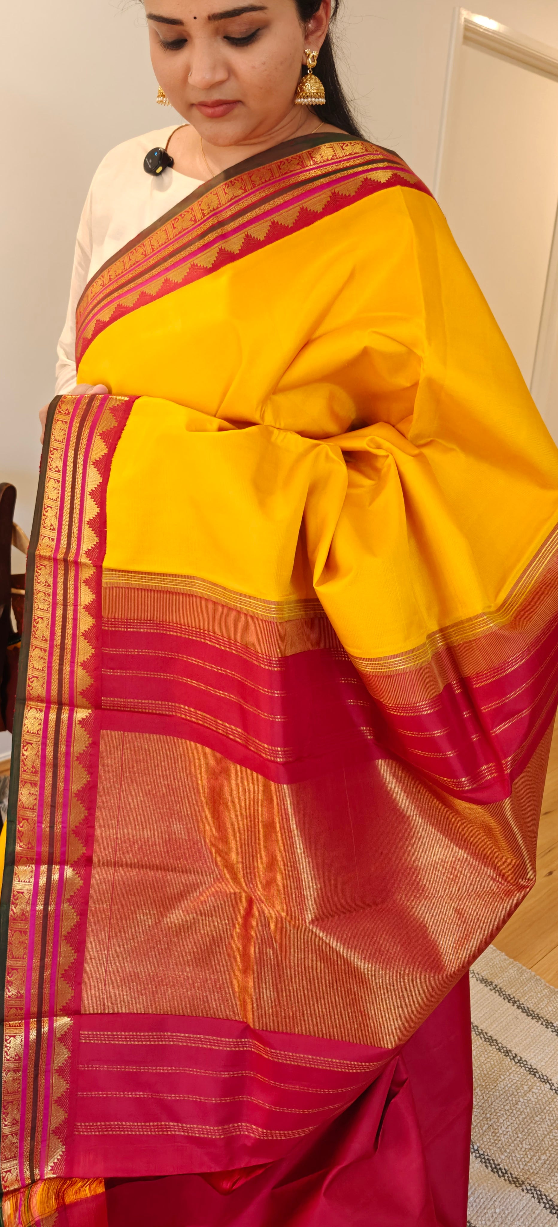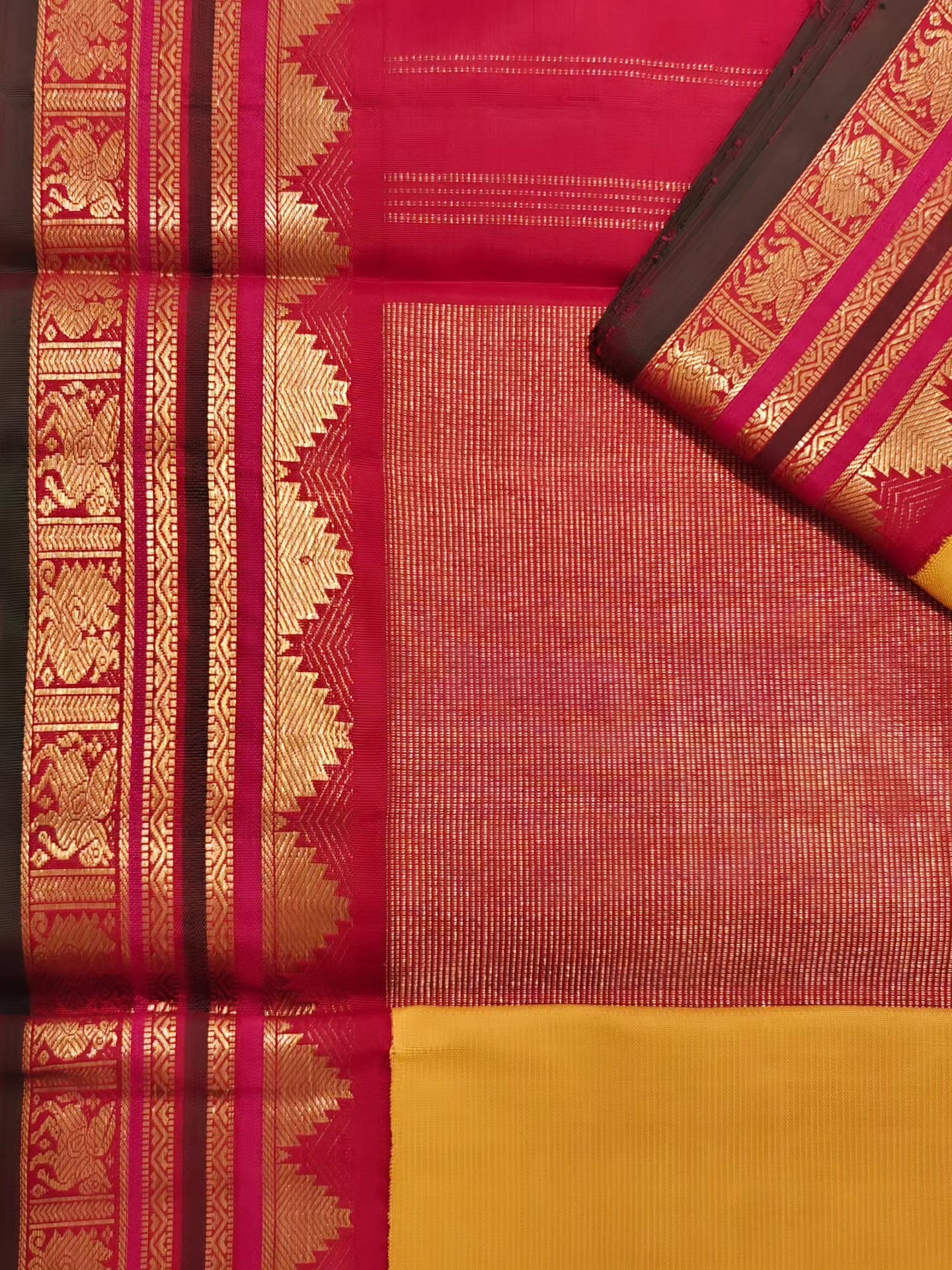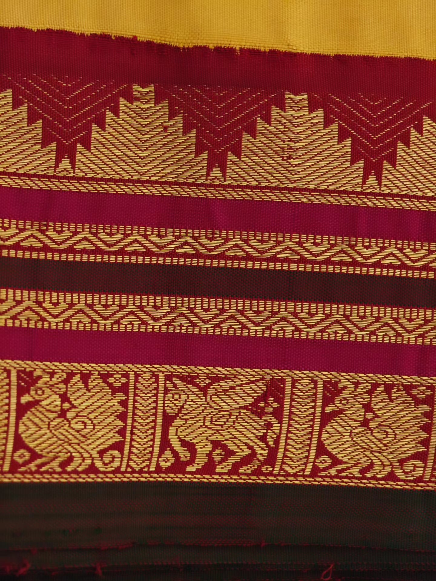 What is your favourite colour to pair with yellow- Red,Pink ,Green ? How about all three,this very elegant yellow Korvai kanjivaram silk sari comes with a red border with temples,horses and peacocks with pink and green colour play in it.