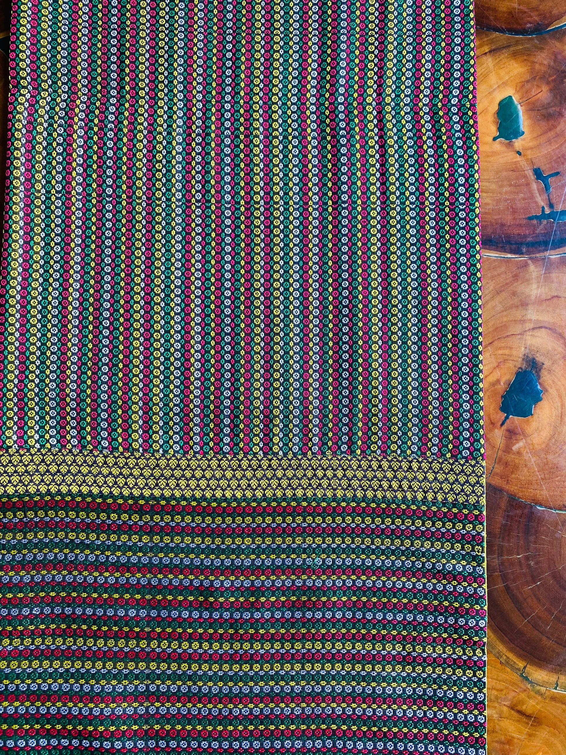 The reversible handloom silk design table runner comes in a variety of colors and seamlessly complements any decor. Featuring panels of silk fabrics in vibrant tones, the dominant color is in shades of emerald green for an eye-catching finish.